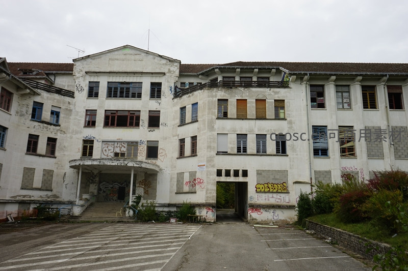 一座多层的白色废弃大楼在阴沉天空下显得格外萧瑟,墙体斑驳,窗户破损,墙上遍布涂鸦,前方是空荡的停车场,周围杂草丛生,诉说着岁月的无情。