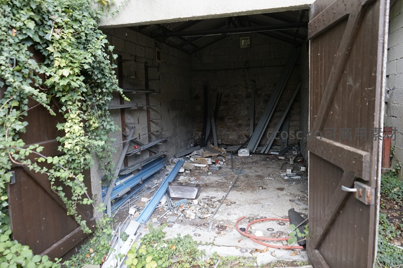 废弃车库内杂乱的金属构件与爬藤植物