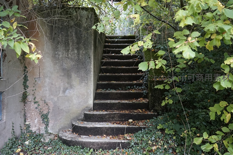 一条被岁月侵蚀的水泥阶梯蜿蜒向上,两侧被浓密的树木和藤蔓包围,落叶铺满台阶,营造出一种静谧、神秘且略带荒凉的氛围,引人探索。