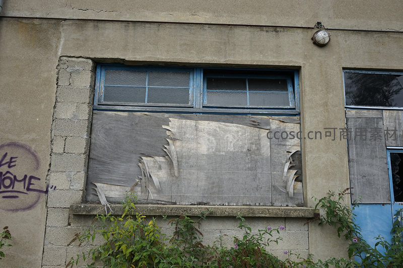 一栋老旧建筑的外墙上,一扇窗户被几块破旧的木板仓促封住,木板边缘已经剥落,墙角长出了野草,旁边的墙面上还有紫色的涂鸦,充满衰败感。