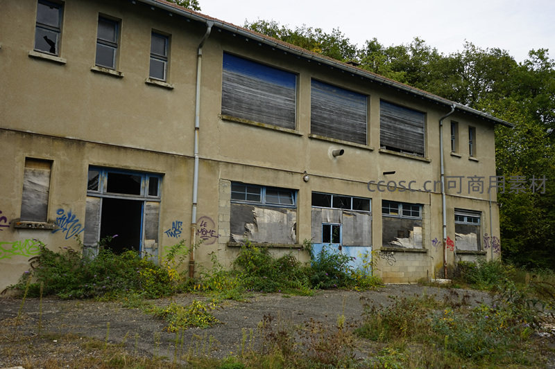 这栋老式厂房侧面尽显荒废之态,多扇窗户玻璃破碎或缺失,门框歪斜,墙面被涂鸦覆盖。门前杂草疯长,透露出一种被遗忘的孤独与历史沉淀。