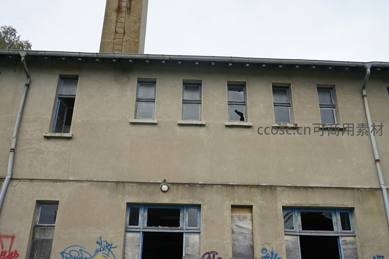 废弃厂房的上层立面,高耸的烟囱在背景中若隐若现,一排排窗户或空洞或破碎,诉说着昔日工业时代的辉煌与如今的寂寥。
