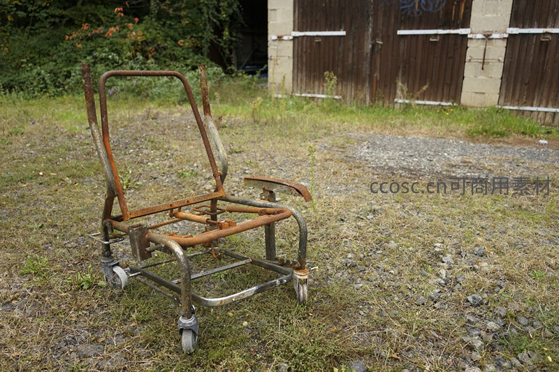 锈迹斑斑的废弃金属推车静置荒地
