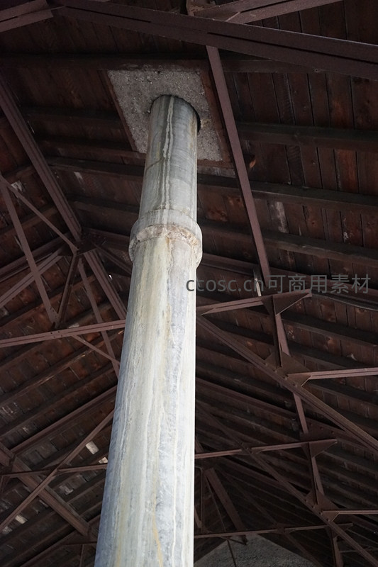 古旧厂房内部的混凝土支柱与木质屋顶结构