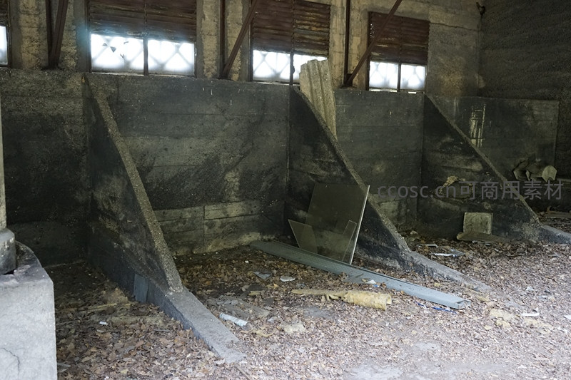 废弃厂房内布满灰尘的混凝土斜坡与破窗
