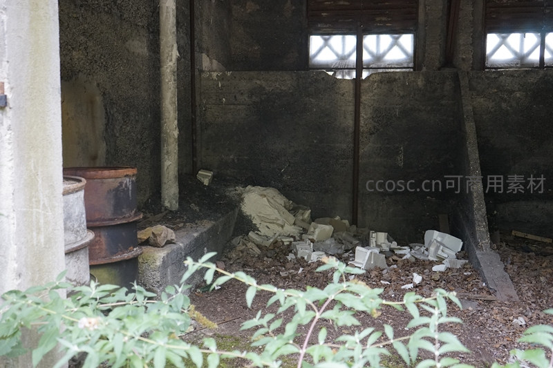 绿植侵入的废弃车间角落与散落碎块