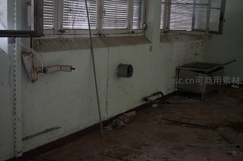 一间被遗弃的厂房内部,墙壁斑驳,地面布满灰尘与杂物。窗框残旧,管道裸露,整体氛围萧条,诉说着昔日工业活动的终结。