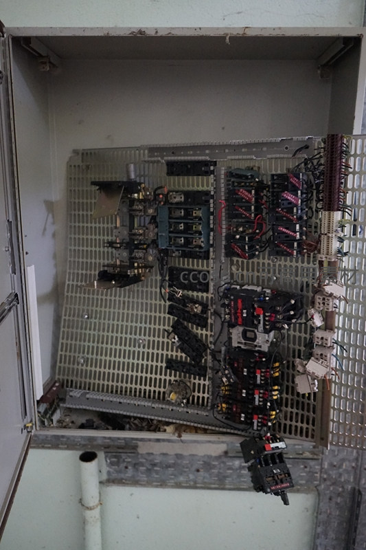打开的工业配电柜内部结构清晰可见,密集的电线、继电器和断路器排列有序,展现了工厂电力系统的核心控制部分。