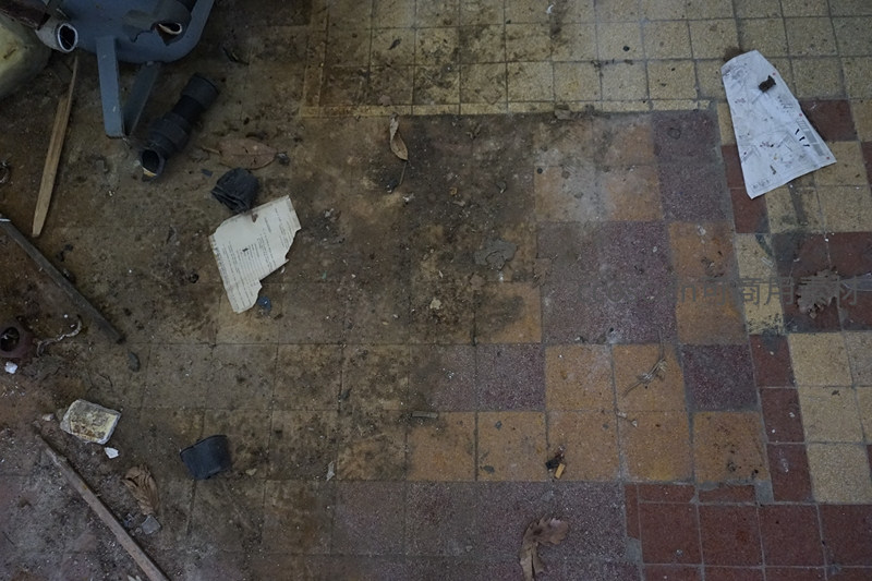 斑驳的方格瓷砖地面上积满尘土和落叶,几张破损纸片随意散落,环境显得久未清扫,充满衰败感。