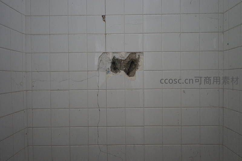 白色瓷砖墙面中央有一处明显的破损,露出了墙体内部的水泥结构,周围瓷砖也有细小裂纹,显示出建筑老化或施工质量问题。