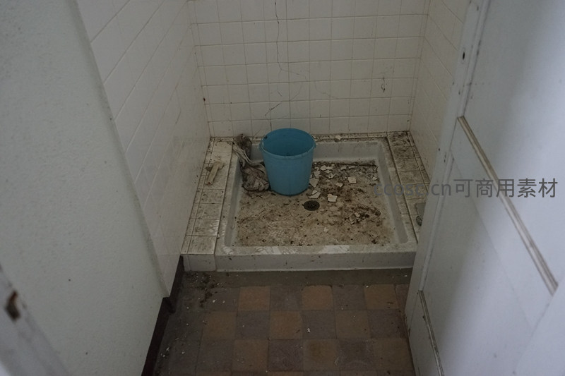 一个废弃的淋浴间,地面布满灰尘和碎屑,中央放着一只蓝色塑料桶,四周瓷砖陈旧,整个空间弥漫着被遗忘的气息。