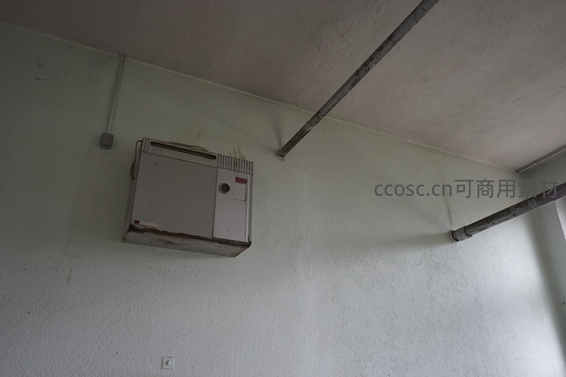 墙上老式电箱,管道横亘天花板显陈旧