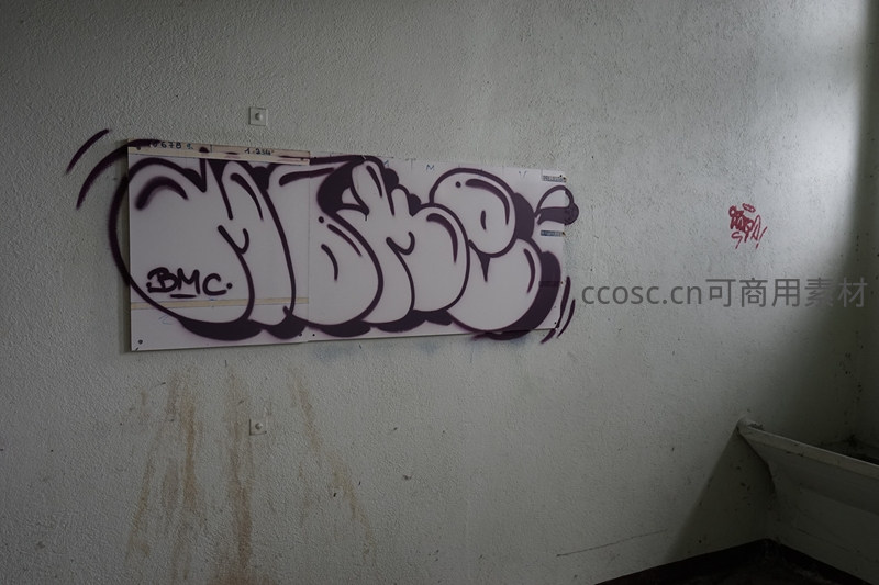 一面略显脏污的白色墙壁上,贴着一张大型黑白涂鸦作品,字体夸张流畅,旁边还有红色小标记,为沉闷空间注入一丝叛逆的艺术活力。
