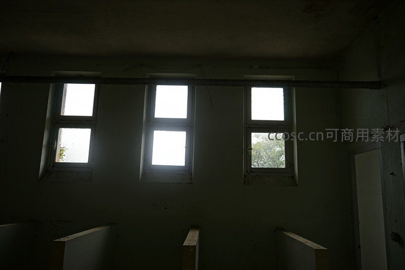 昏暗的废弃房间内,三扇高窗将外界的明亮光线引入,形成强烈的明暗对比,墙壁斑驳,空间寂静,仿佛时间在此凝固。