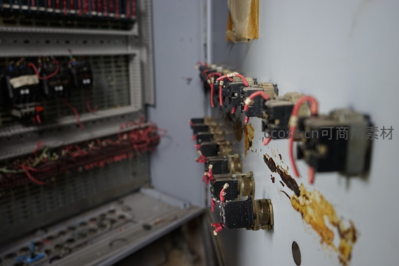 近距离拍摄工业电控箱内部结构,红色电线密集连接着多个黑色继电器,金属背板布满孔洞,整体呈现使用多年后的磨损状态。