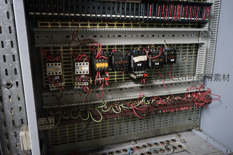 工业配电柜内部,杂乱电线与多个接触器