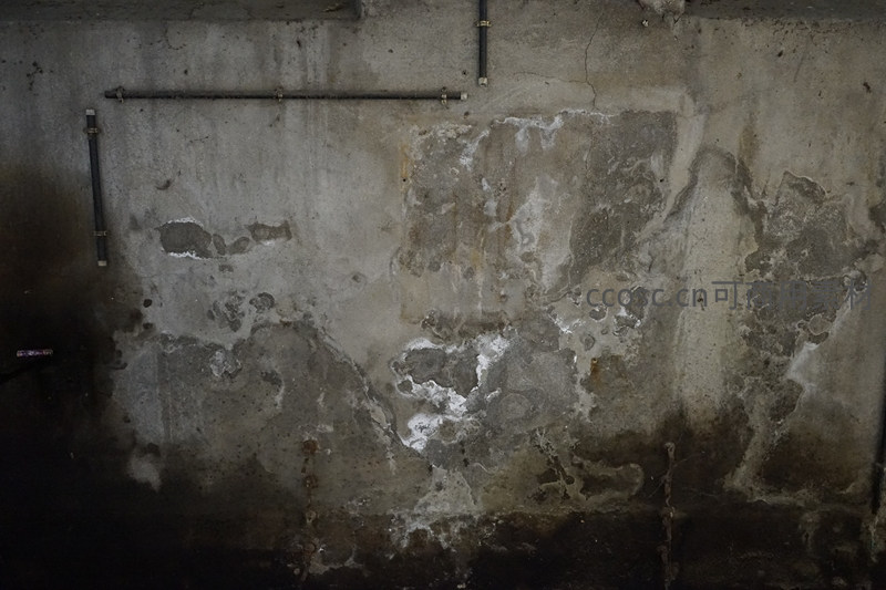 一面混凝土墙因长期受潮而产生大面积白色盐碱结晶,墙面上方横亘着黑色管道,整体画面充满工业废弃空间的阴冷与侵蚀感。