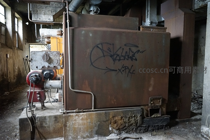 在空旷的废弃厂房中,一台巨大的生锈锅炉静置一旁,其表面被涂鸦覆盖,旁边是同样锈迹斑斑的红色泵机,共同诉说着工业时代的落幕。