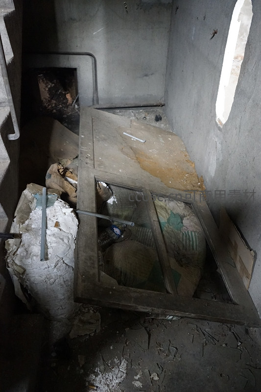 一间封闭的废弃房间内,一扇破旧的木窗倒在地上,玻璃碎裂,周围堆满白色泡沫块和垃圾,墙壁冰冷,只有微光从高窗渗入。