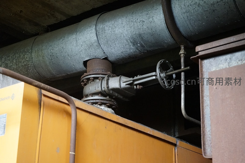 这张图片展示了工业环境中的一处管道阀门特写。粗大的金属管道和手动阀门清晰可见,表面布满岁月留下的锈迹和磨损痕迹,彰显出工业设施的厚重与沧桑感。