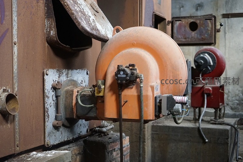一台橙色的大型工业风机紧邻着锈迹斑斑的锅炉,复杂的管道和阀门连接着它们,共同构成了一个充满年代感的工业场景。