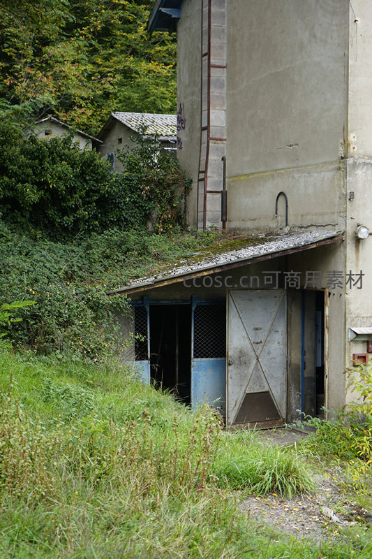 废弃厂房角落,绿植丛生显荒凉