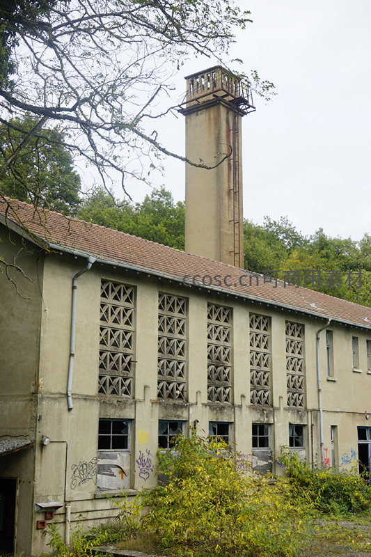 废弃工厂高塔,树木环绕显沧桑