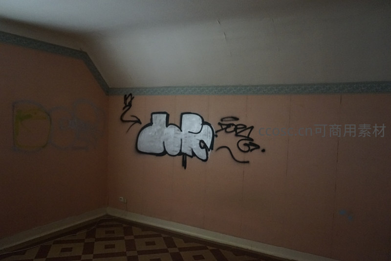 一个空荡的房间角落,粉红色的墙面上喷绘着醒目的黑白涂鸦。天花板与墙壁交界处保留着一条精致的复古花纹墙纸边饰,与下方磨损的几何图案地砖共同诉说着空间曾经的体面与如今的颓败。