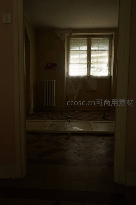 废弃房间内阳光透过百叶窗洒落