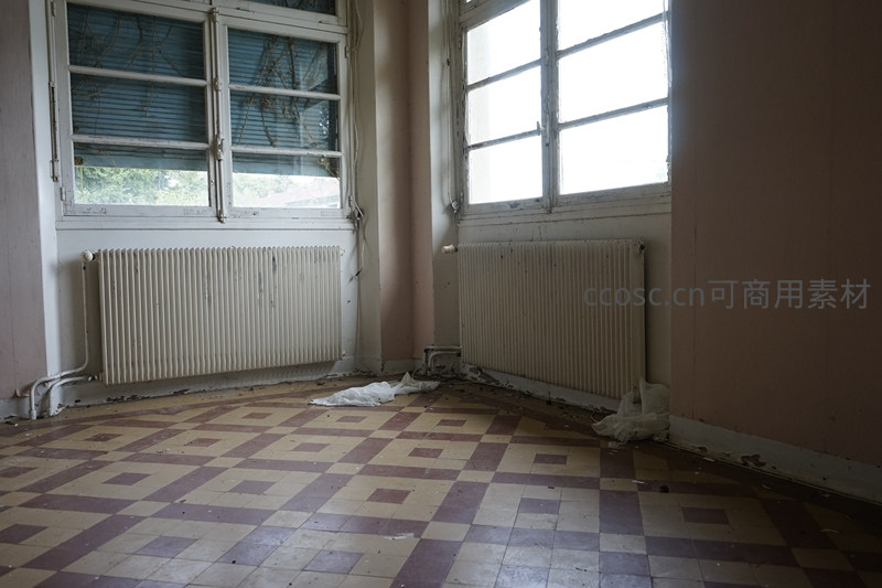 一个被遗弃的房间角落,两台老式暖气片靠墙而立,地面铺着红白相间的几何图案地砖,墙皮剥落,窗户蒙尘,透出时光流逝的沧桑感。