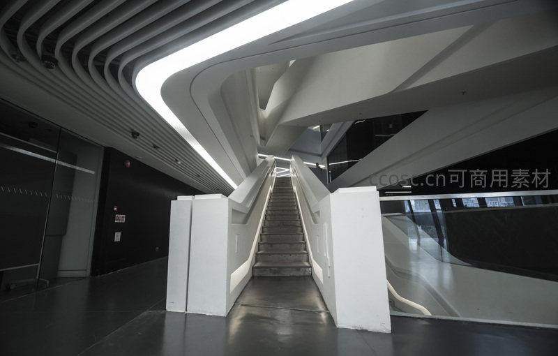 极具未来感的楼梯间设计,白色几何墙体搭配流畅弧形LED灯带,光线柔和而富有层次,营造出科技与艺术融合的视觉体验和空间导向性。
