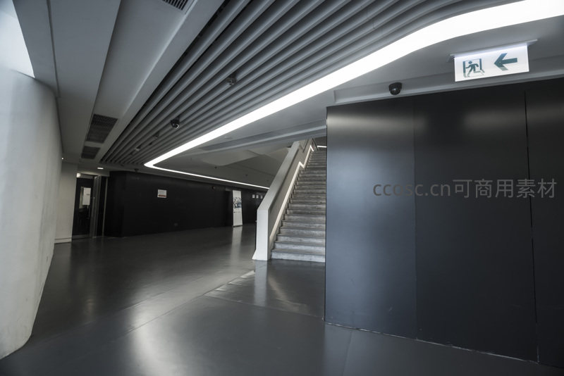 黑白灰为主色调的现代建筑内部,流畅线条的天花板与嵌入式灯光营造出科技感十足的空间氛围,楼梯与墙面构成几何美感。