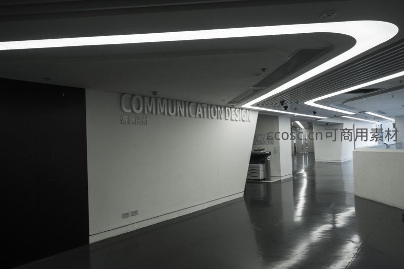 简洁明亮的办公入口区,墙面立体字标识“COMMUNICATION DESIGN”突出企业定位,柔和灯带与灰色地面搭配,展现专业与创意并重的企业形象。