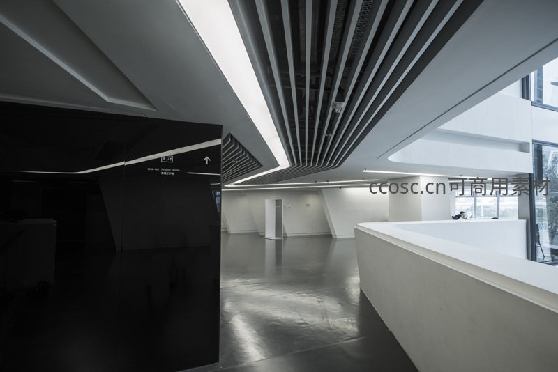 开阔的办公区域,前台简洁流畅,挑高天花板配以放射状条形吊顶,增强空间纵深感,大面积窗户引入自然光,打造明亮舒适的现代工作环境。