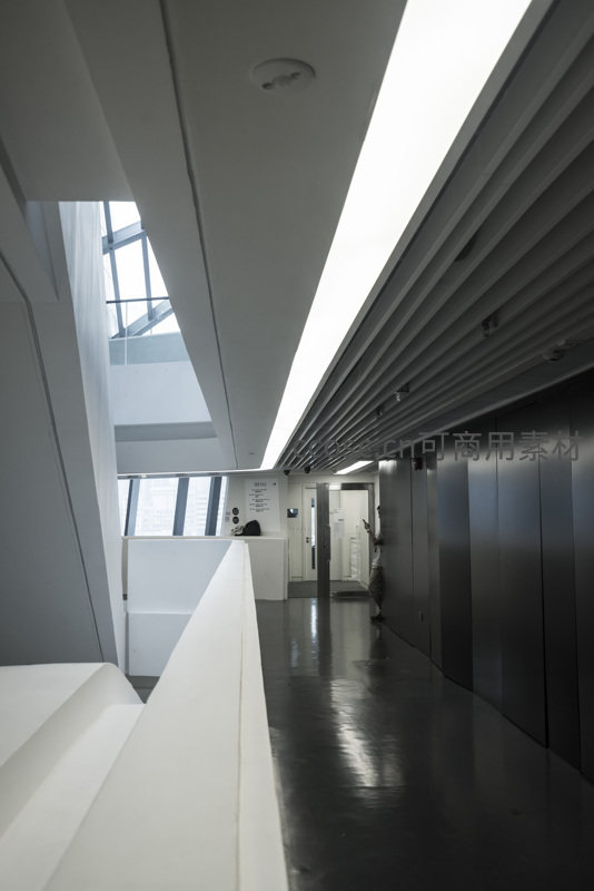 一条充满现代感的办公走廊,以白色墙壁与深色地面形成强烈对比,天花板的线性灯光与结构线条营造出简洁而富有层次的空间美学。