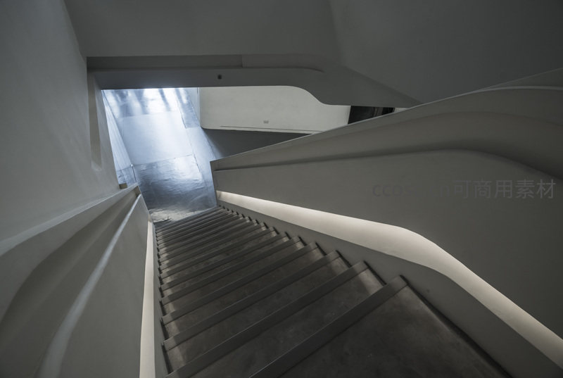 从高处俯瞰,楼梯在柔和的自然光与人工灯带映衬下显得宁静而富有层次。纯白墙体与深灰台阶构成视觉焦点,体现出现代建筑设计中对光线与材质的精妙运用。