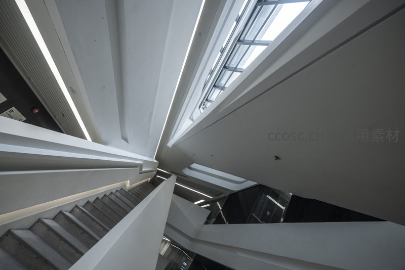 从低角度仰拍现代建筑内部,白色楼梯与天花板在嵌入式灯光下形成强烈几何线条,营造出简洁、空灵且富有未来感的空间氛围。