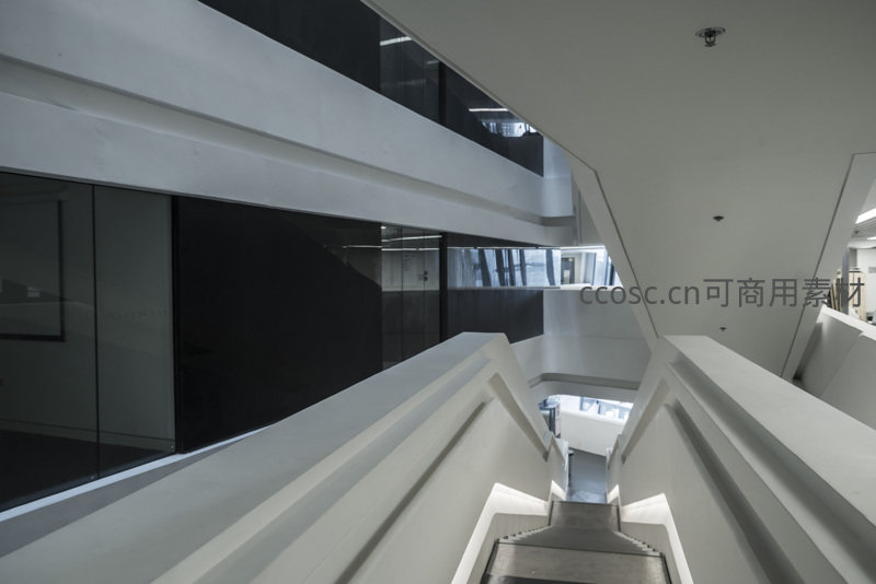 白色的流线型墙体与深色的玻璃幕墙形成鲜明对比,楼梯作为视觉引导,将观者的目光引向深处,展现了建筑内部精妙的空间布局。