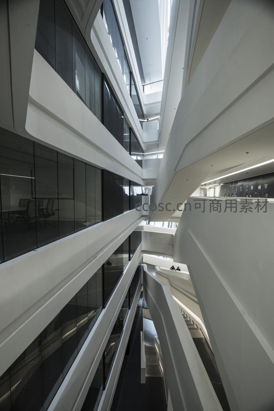 多层办公空间的开放式中庭设计,白色曲面墙体与玻璃幕墙结合,自然光贯穿上下,创造出明亮、通透且富有流动性的商务办公环境,提升空间活力与协作氛围。
