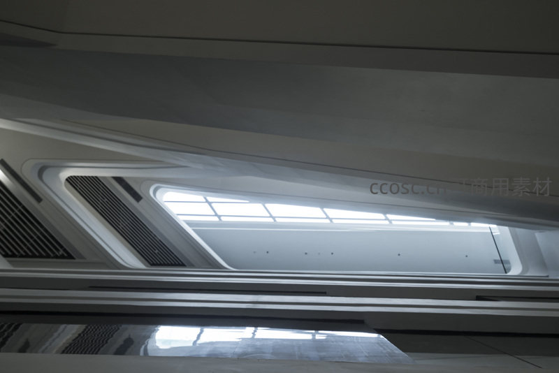 从低角度仰拍现代建筑内部,流畅的曲线与直线结构交织,自然光透过天窗洒落,营造出宁静而富有科技感的空间氛围。