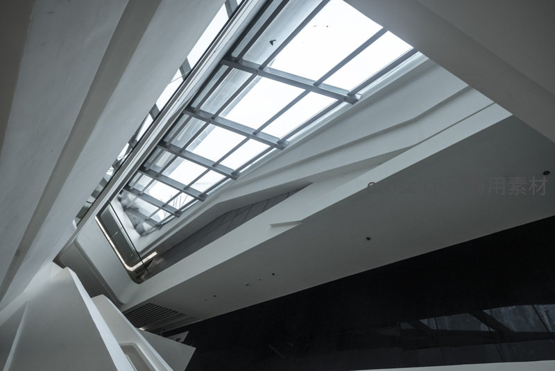 向上视角捕捉到建筑内部的流线型设计,白色曲面墙体与格栅状天窗相映成趣,光线穿透玻璃,在墙面上投下柔和的阴影,充满艺术气息。