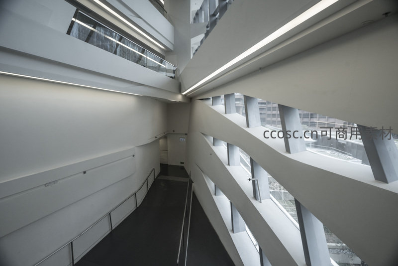 狭长走廊两侧以纯净白色墙体与金属栏杆勾勒轮廓,尽头处自然光与人工照明交融,形成明暗对比,增强空间纵深感。