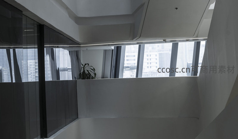 明亮通透的现代办公走廊与绿植点缀