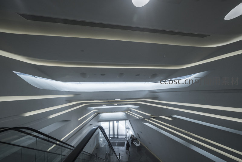 商场中庭采用流线型天花板和嵌入式灯带,搭配自动扶梯形成视觉引导,整体空间充满未来主义风格与流动美感。