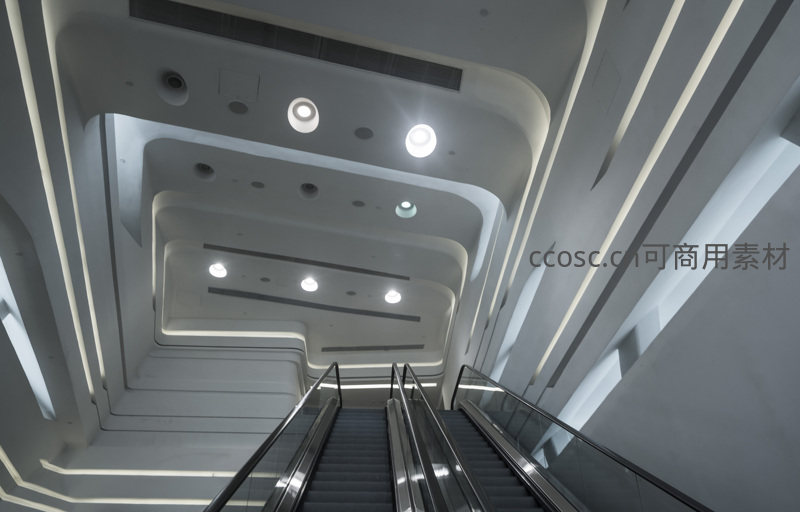 以低角度仰拍展现现代建筑内部的流线型结构,白色曲面墙体与嵌入式灯带交织,营造出未来感十足的空间氛围,凸显建筑与光影的艺术融合。