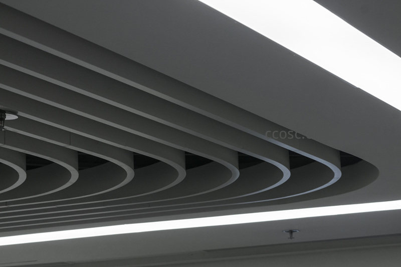 画面聚焦于室内天花板的几何线条构造,柔和的灯带与深色条板形成强烈对比,展现出现代建筑设计中对光影与结构的精妙把控,赋予空间层次与节奏感。