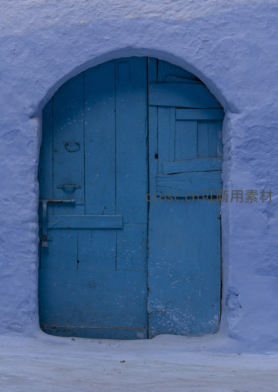 一道古朴的蓝色木门被嵌入厚实的白色泥墙拱门内,门板斑驳,锁扣生锈,诉说着岁月的痕迹与宁静的北非小镇故事。