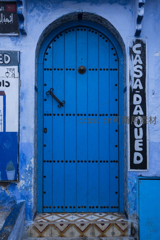 一扇宏伟的蓝色拱形木门,布满黑色铆钉和复古门环,两侧有招牌,门前铺着几何图案地砖,是摩洛哥特色民宿的典雅入口。
