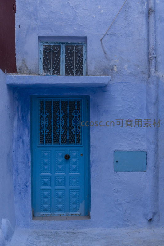 浅蓝色墙面下,一扇带有菱形浮雕的蓝色门与上方铁艺窗形成几何呼应,自然光勾勒出墙面肌理,营造出静谧、文艺且富有设计感的城市角落。