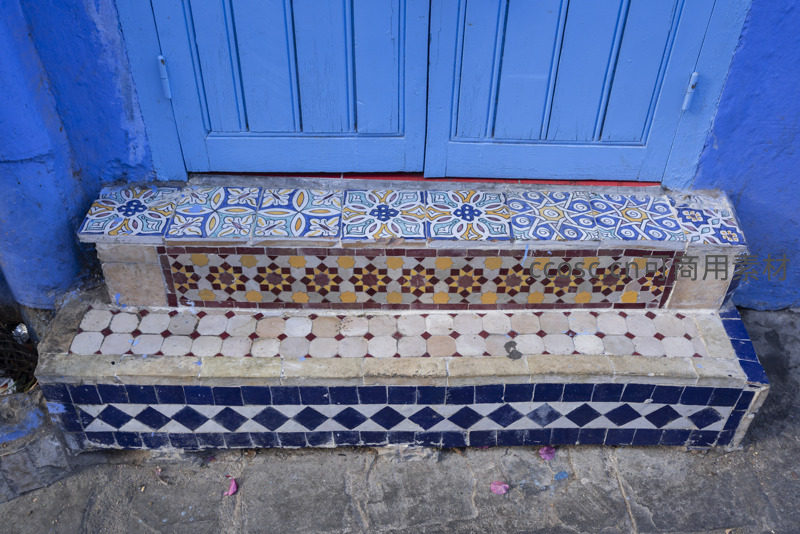 蓝色木门前的石阶镶嵌着色彩斑斓的马赛克瓷砖,几何花纹精致典雅,展现摩洛哥传统手工艺与建筑装饰的独特魅力。
